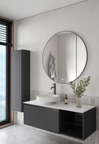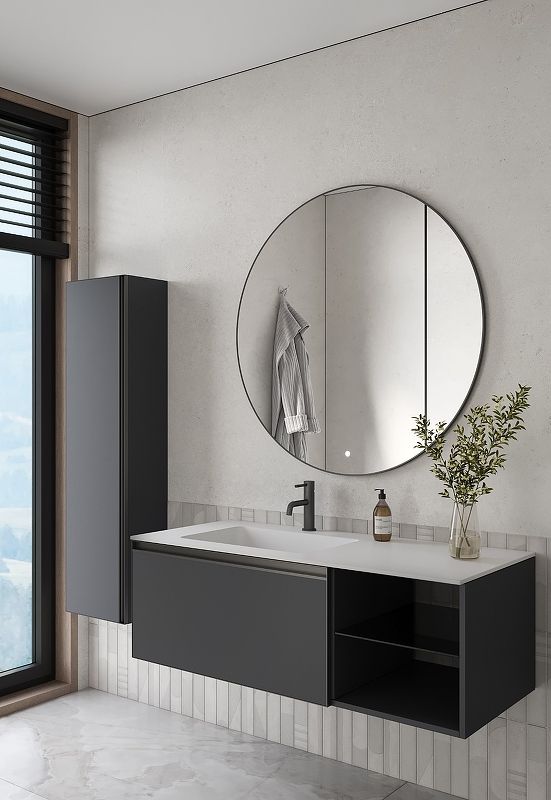Главной особенностью коллекции являются обрамления фасадов из алюминия в самых трендовых цветах: графит, матовое золото, матовый черный и серебро. Эти обрамления идеально дополняют сантехнику в ванной комнате.