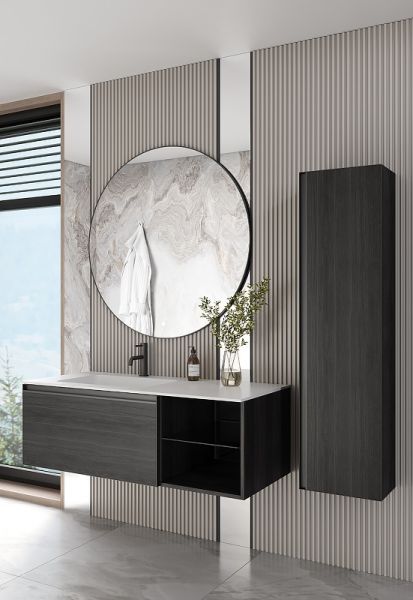 Главной особенностью коллекции являются обрамления фасадов из алюминия в самых трендовых цветах: графит, матовое золото, матовый черный и серебро. Эти обрамления идеально дополняют сантехнику в ванной комнате.