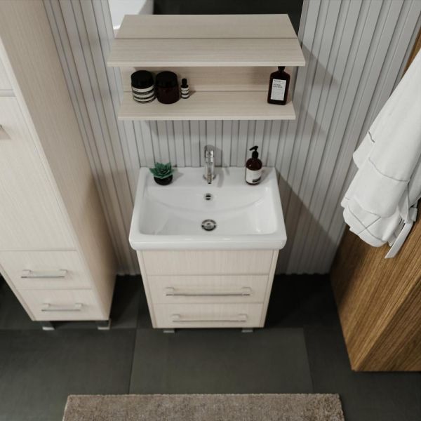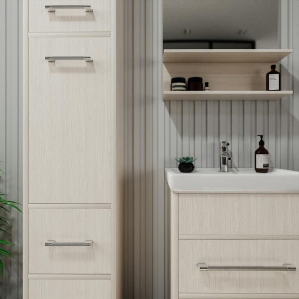 Удобная система хранения позволяет размещать все необходимое для гигиенических процедур, а её продуманные размеры отлично вписываются даже в небольшие помещения. Стильные ручки и элегантные фасады придают тумбе особый шарм, а разнообразие цветовых решений позволит выбрать модель, соответствующую любому интерьеру – от классического до модерн.