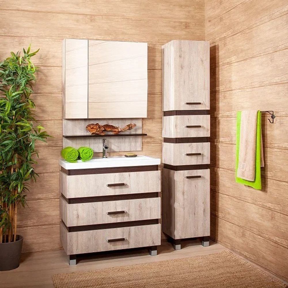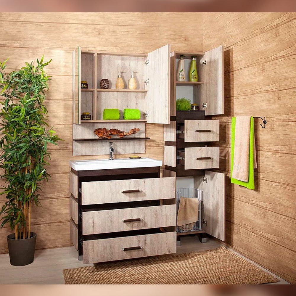 Удобная система хранения позволяет размещать все необходимое для гигиенических процедур, а её продуманные размеры отлично вписываются даже в небольшие помещения. Стильные ручки и элегантные фасады придают тумбе особый шарм, а разнообразие цветовых решений позволит выбрать модель, соответствующую любому интерьеру – от классического до модерн.