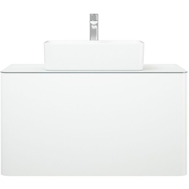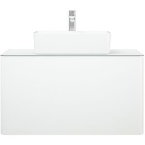 Подвесная тумба "Рино 90" оснащена 1 выдвижным ящиком на направляющих "push to open". Высота ящика - 85 мм. Внутри располагается ещё один ящик высотой 85 мм. Для открывания нужно нажать на фасад ящика. Все ящики имеют выпилы под коммуникации. Сверху на крышке есть стеклянная крашенная столешница. Есть вырезы для коммуникаций раковин в столшнице. Фасады, боковины - МДФ в плёнке. Есть подвесы для крепления к стене. Столешница тумбы изготовлена из высококачественного и очень прочного стекла "Лакобель". Раковина может быть выбрана на любой вкус. Классический вариант для комплектования тумбы "Рино 90" - раковина "Олимпия 56".