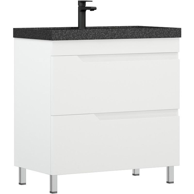 Тумба Юрма оснащена двумя выдвижными ящиками. Ящики на направляющих скрытого монтажа 350 мм с доводчиками. Фасады без ручек - есть специально сделанная фрезеровка для открывания. Верхний ящик высотой 135 мм с выпилом под коммуникации, нижний высотой 135 мм. 4 хромированные опоры на 100 мм. Фасадная часть и боковины покрашены в глянцевую белую эмаль. Увеличенная толщина фасада до 19 мм. Корпус - ЛДСП 16 мм белый.Характеристики:Цвет: белый.
