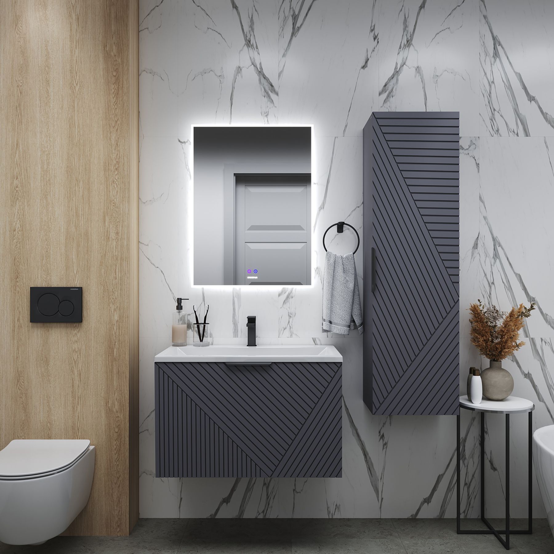 Корпус и фасады выполнены из влагостойкого МДФ, покрытого высококачественной матовой краской. Это гарантирует устойчивость к влаге и долговечность при ежедневном использовании в условиях повышенной влажности.
