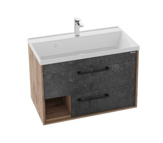 Тумба подвесная Реал 80 см - функциональное, стильное и практичное исполнение. Фасады в цвете бетон безупречно сочетаются с фактурой под дерево и позволяют тумбе органично вписаться в интерьер ванной комнаты в стиле лофт и модерн.