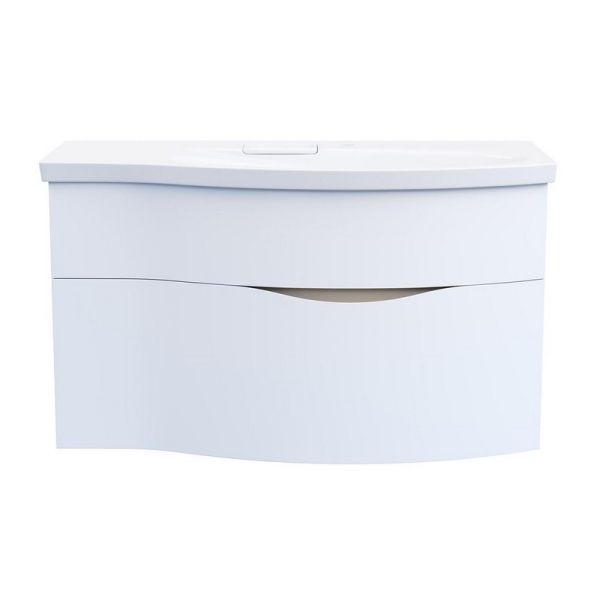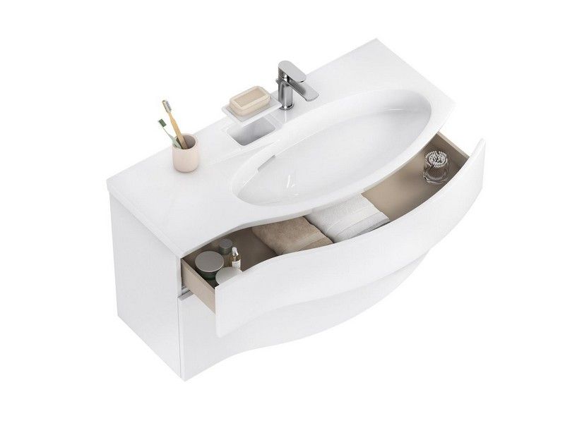 Белая матовая тумба с гнутым фасадом с правым расположением овальной зоны, ширина 100 см. Внутренняя планка окрашена в песочный цвет. Тумба представлена в версии с двумя ящиками, снабжена врезными удобными ручками, которые образуют на фасаде изящную «улыбку». Благодаря смещенному сливу раковины, верхний ящик не имеет вырез под сифон. Сочетается с раковиной Riva с правым расположением чаши.