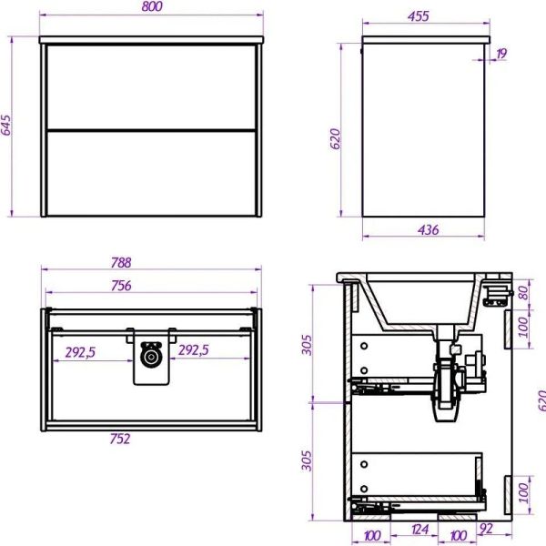 Габариты корпуса тумбы (ШхВхГ): 788х620х436 мм.