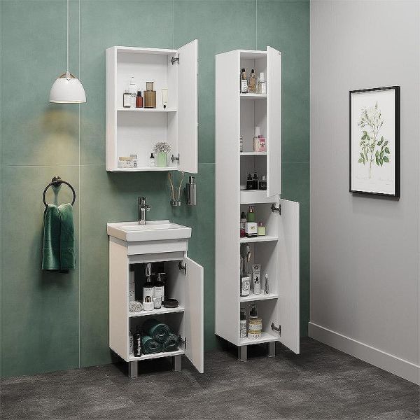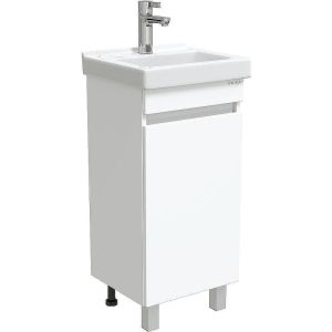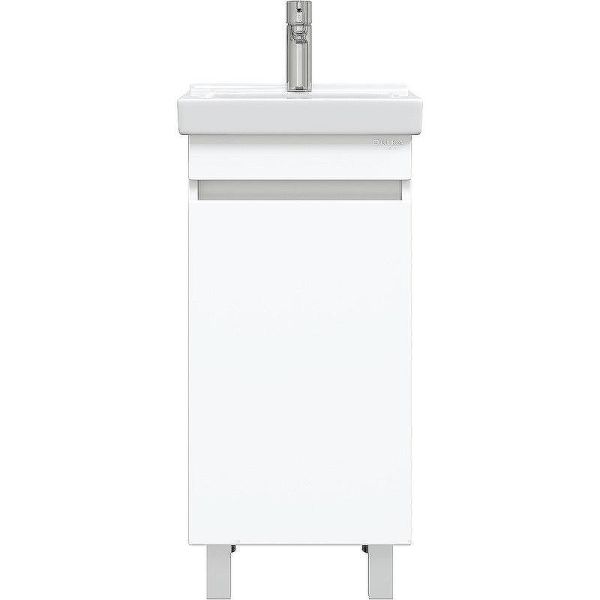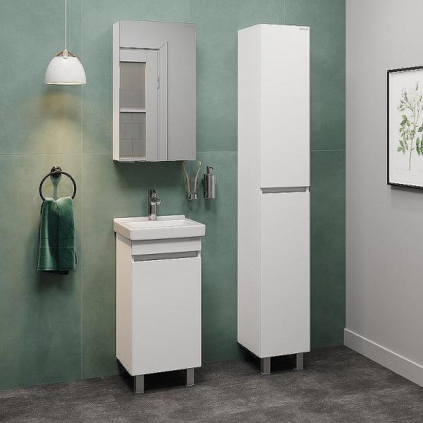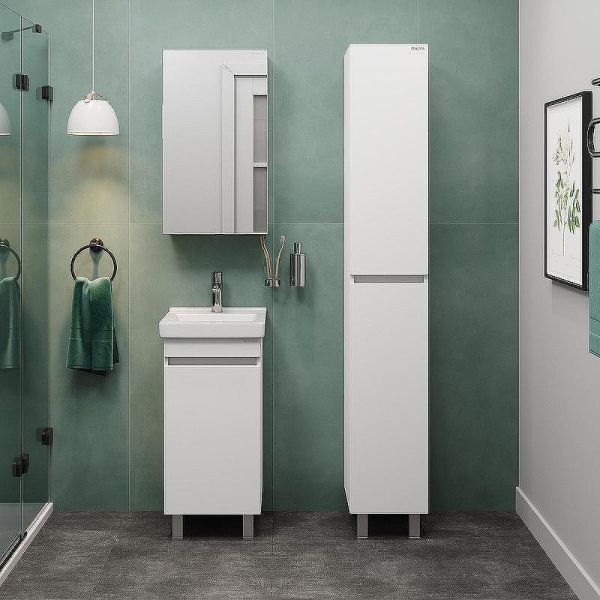 Тумба имеет белый глянцевый фасад и строгие формы без декора. За дверцей с интегрированной ручкой скрывается пространство с полкой для размещения необходимых бытовых принадлежностей.