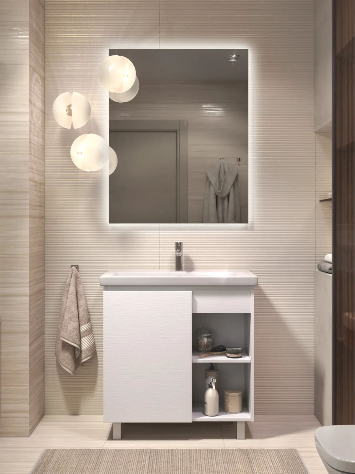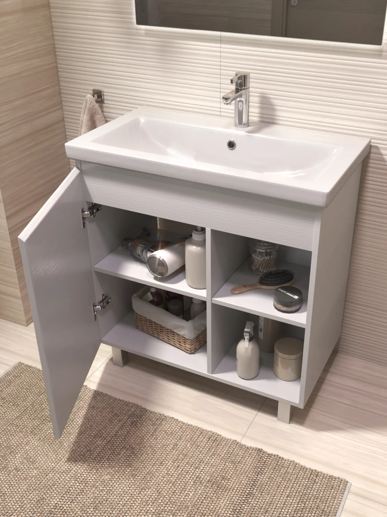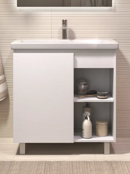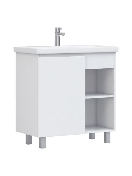 Тумба Milos 80, напольная, 1 дверца, белая (под ракоовину Como 80). Оснащение: 1 дверца, петли с механизмом доводчика, 2 полки ЛДСП, 4 опоры квадратные регулируемые. Колекция VIGO MILOS: петли с доводчиком, полки из влагостойкой ЛДСП, толщина 16 мм, интегрированные ручки, декор материала с имитацией под дерево.