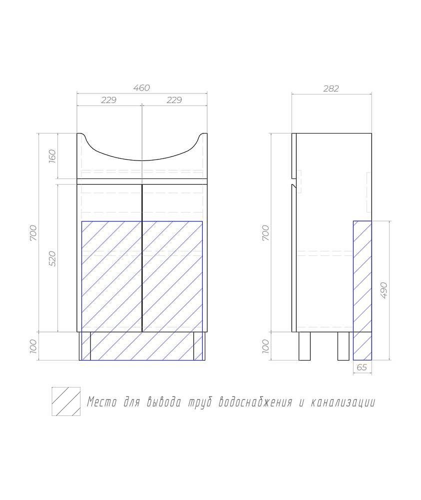 2 дверцы, 1 полка ЛДСП, опоры регулируемые квадратные. Специальный сифон Vigo в комплекте.Материал корпуса и фасада: влагостойкая ЛДСПДверцы: петли с механизмом плавного закрыванияОтсутствие лицевой фурнитуры – интегрированная в фасад ручка