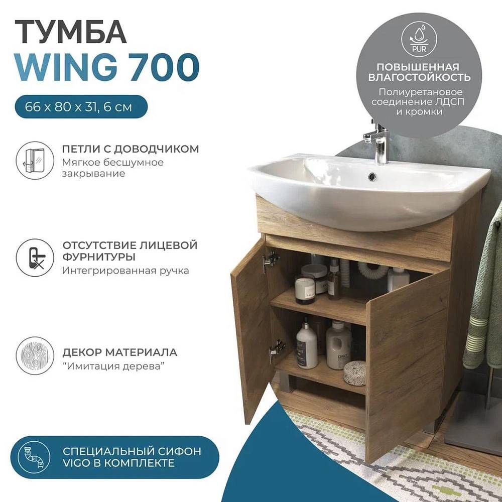Тумба под раковину напольная VIGO Wing tn.WIN.BAL.70.2D дуб золотой, 70 см. Гарантийный срок 2 года. Монтаж: напольный. Доводчик: да. Нажимной механизм: нет.