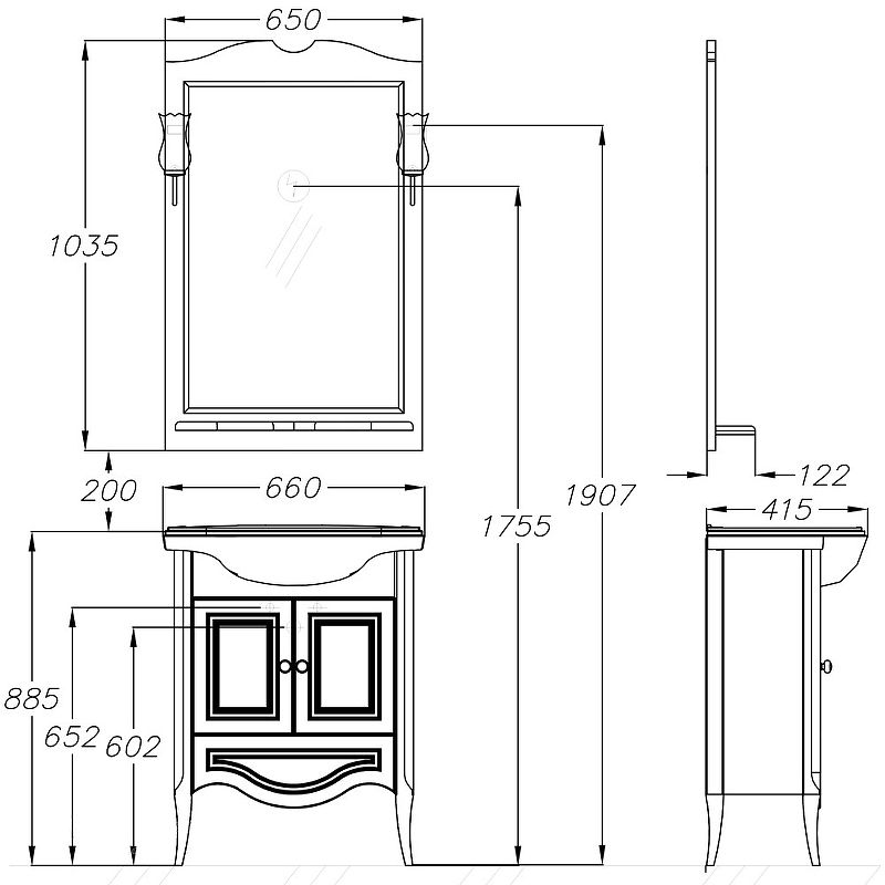 Габариты тумбы с раковиной: (ШхВхГ): 66x88,5x41,5 см.