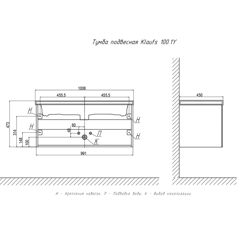 Тумба под раковину подвесная Velvex Klaufs tp.KLA.MAR.100.1Y белый, 100 см