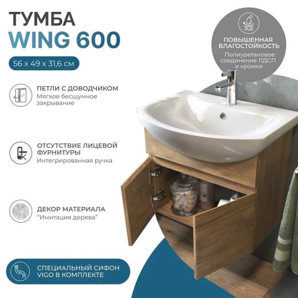 Тумба под раковину подвесная VIGO Wing tp.WIN.BAL.60.2D дуб золотой, 60 см. Гарантийный срок 2 года. Монтаж: подвесной. Доводчик: да. Нажимной механизм: нет.