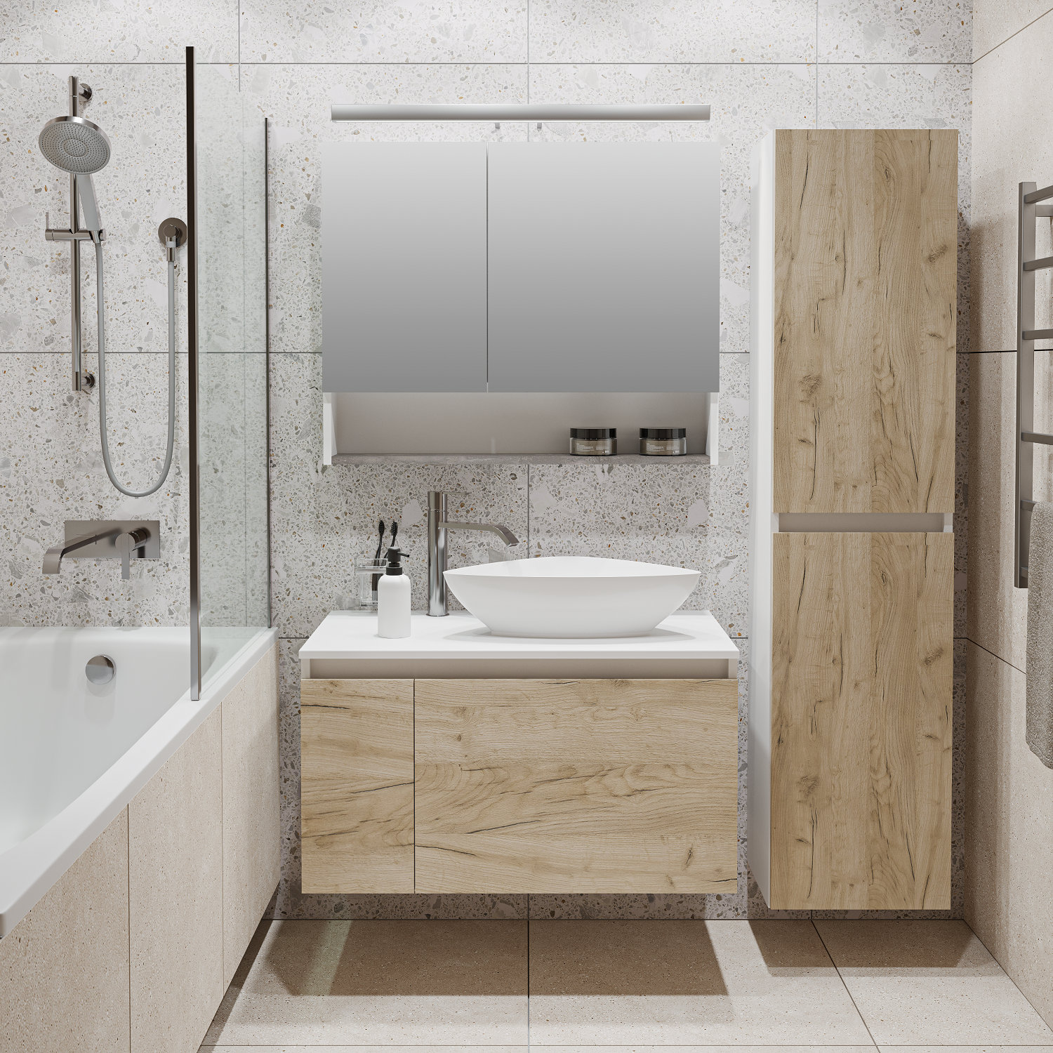 Тумба под раковину в ванную RUNO БАРИ (подвесная) - безупречное сочетание модных тенденций с классическим оформлением ванной комнаты. Тумба под раковину БАРИ оснащена выдвижным ящиком на шариковых направляющих, с системой плавного закрывания с правой стороны и распашной дверцей с левой стороны, дверца укомплектована двумя петлями верхняя с доводчиком, нижняя без доводчика. Цвет корпуса классический - белый, при этом цвет фасада в модном цвете – крафтовый дуб, идеально впишутся в любой интерьер ванной комнаты. К тумбе для ванной подойдут умывальники на столешницу: «OVALE 50» (50х36см) - идеальное решение для стильного интерьера ванной, создан для минималистичных интерьеров и подойдёт для санузлов в стиле лофт, минимализм и хай-тек. Строгая овальная геометрически правильная форма раковины, усиливает идею лаконичности в дизайне, устанавливается на столешницу, накладным методом. «PALLA D41» (диаметр 41см) - идеальное решение для стильного интерьера ванной, создан для минималистичных интерьеров и подойдёт для санузлов в стиле лофт, минимализм и хай-тек. Строгая круглая геометрически правильная форма раковины, усиливает идею лаконичности в дизайне, устанавливается на столешницу, накладным методом. «TRE 48» (48х37см) - идеальное решение для стильного интерьера ванной, создан для минималистичных интерьеров и подойдёт для санузлов в стиле лофт, минимализм и Хай-Тек. Строгая прямоугольная форма с округлыми углами усиливает идею лаконичности в дизайне, устанавливается на столешницу, накладным методом. «TERZO 60» (59х39см) - идеальное решение для стильного интерьера ванной, создан для минималистичных интерьеров и подойдёт для санузлов в стиле лофт, минимализм и хай-тек. Асимметричная раковина, которую можно установить любой стороной, дизайнерское решение для нестандартных интерьеров, усиливает идею лаконичности в дизайне, устанавливается на столешницу, накладным методом.