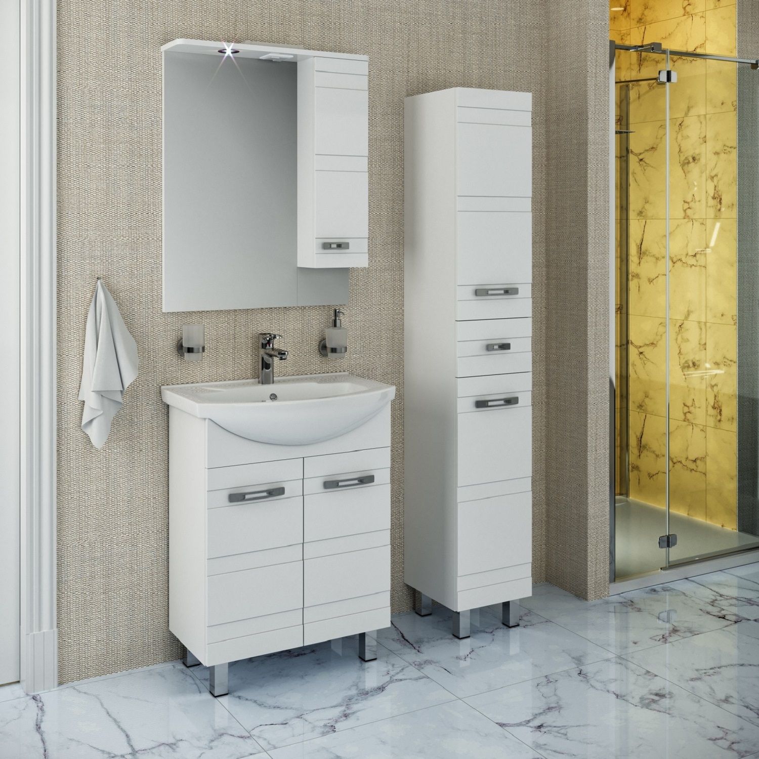 Тумба под умывальник напольная с двумя распашными фасадами и одной внутренней полкой. Петли со встроенным доводчиком, ручки - 2шт, ножки хром - 2шт, ножки пластик -2шт.