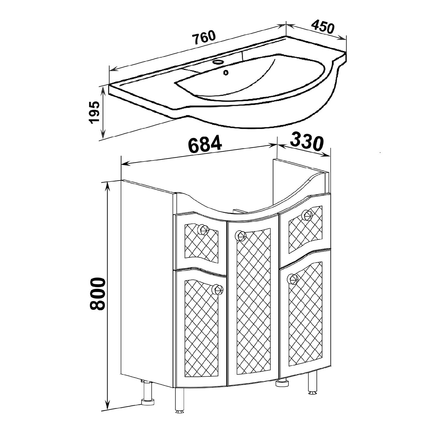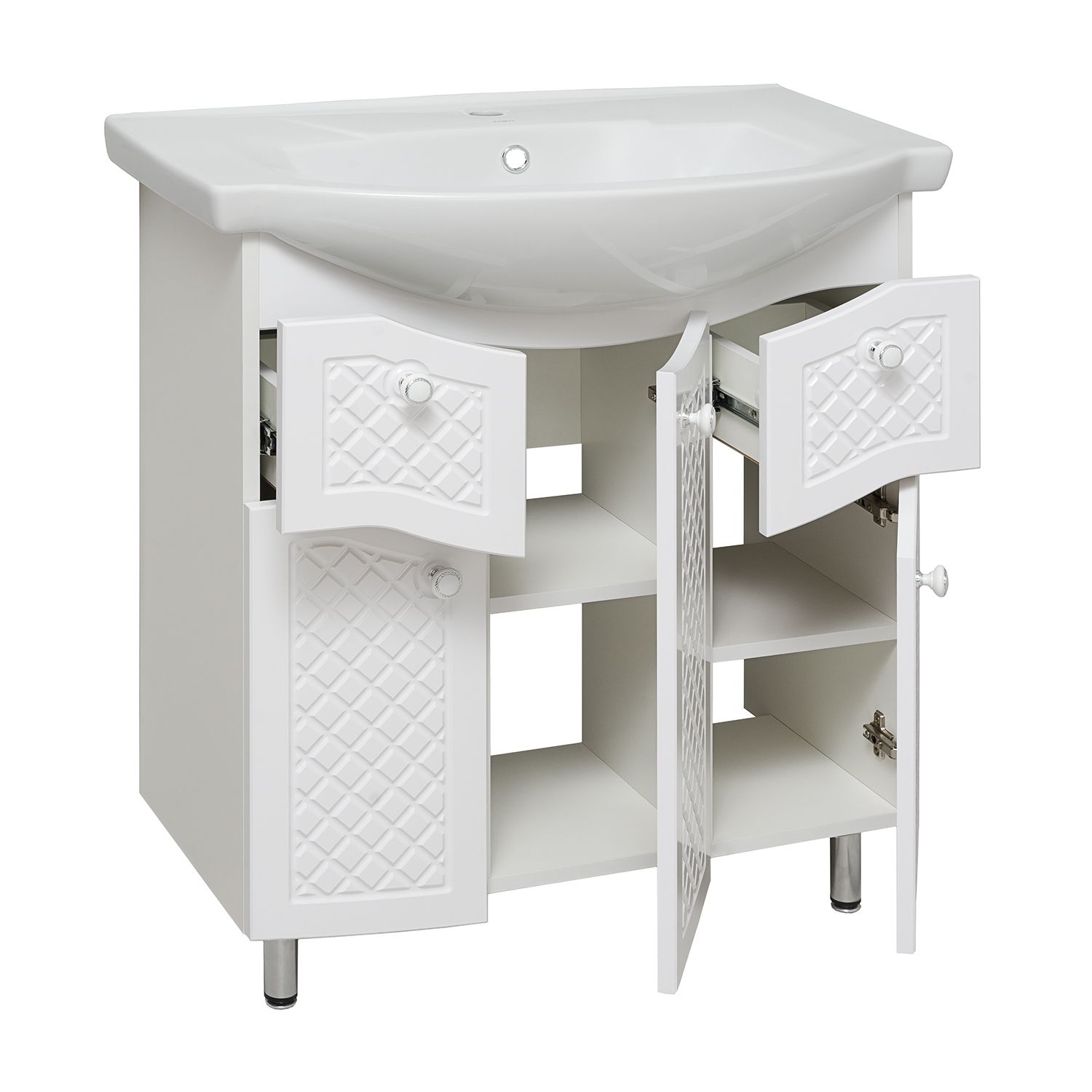 Тумба под умывальник на ножках с тремя распашными дверками и двумя боковыми выдвижными ящиками. За центральной дверкой -одна внутренняя полка. Петли со встроенным доводчиком, ящики на шариковых направляющих полного выдвижения, ручки - 5шт, ножки хром - 2шт, ножки пластик -2шт.