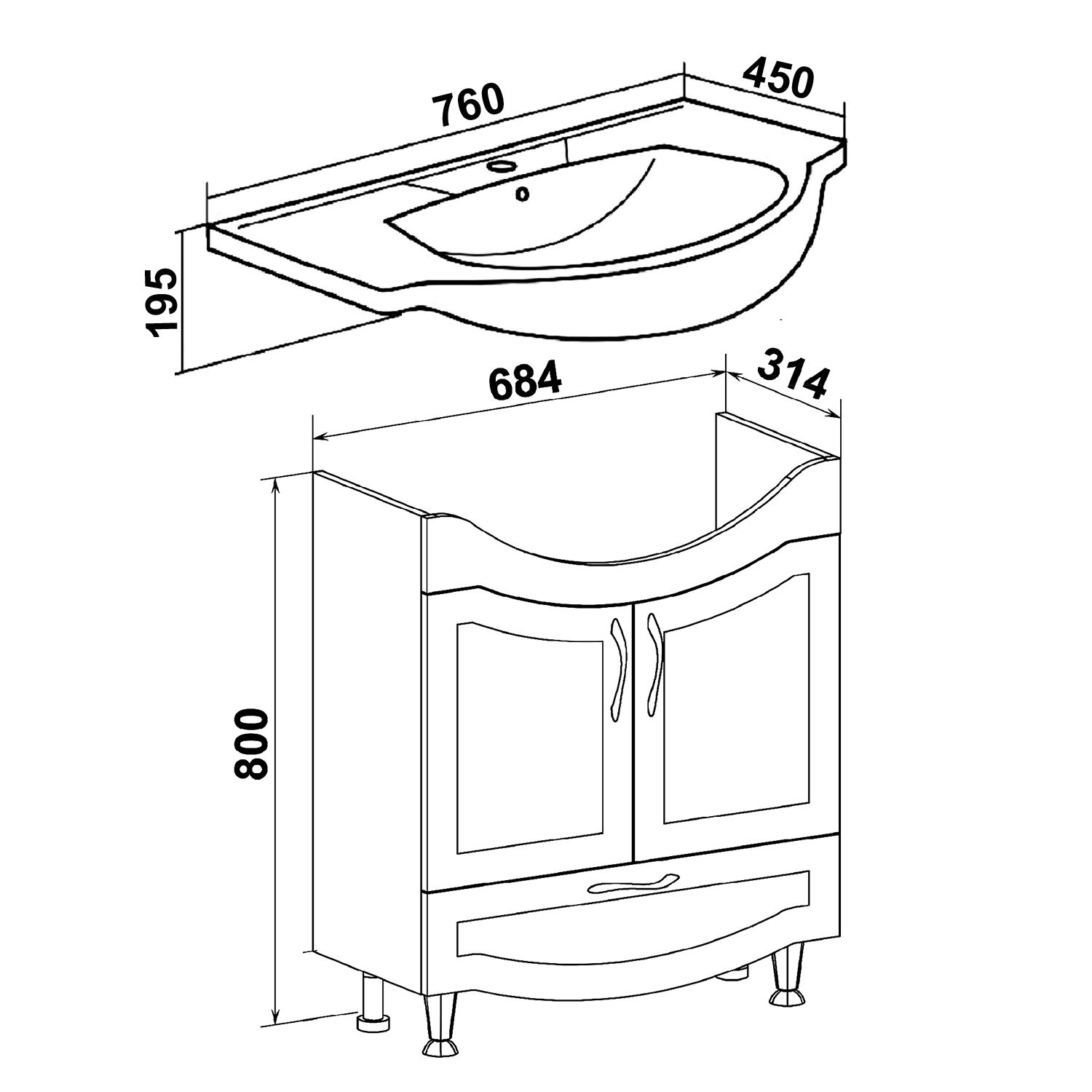 Тумба под умывальник напольная с двумя распашными дверками и нижним выдвижным ящиком. За фасадами - одна встроенная полка. Петли со встроенным доводчиком, ящик - на шариковых направляющих полного выдвижения, ручки - 3шт, ножки хром - 2шт, ножки пластик -2шт.