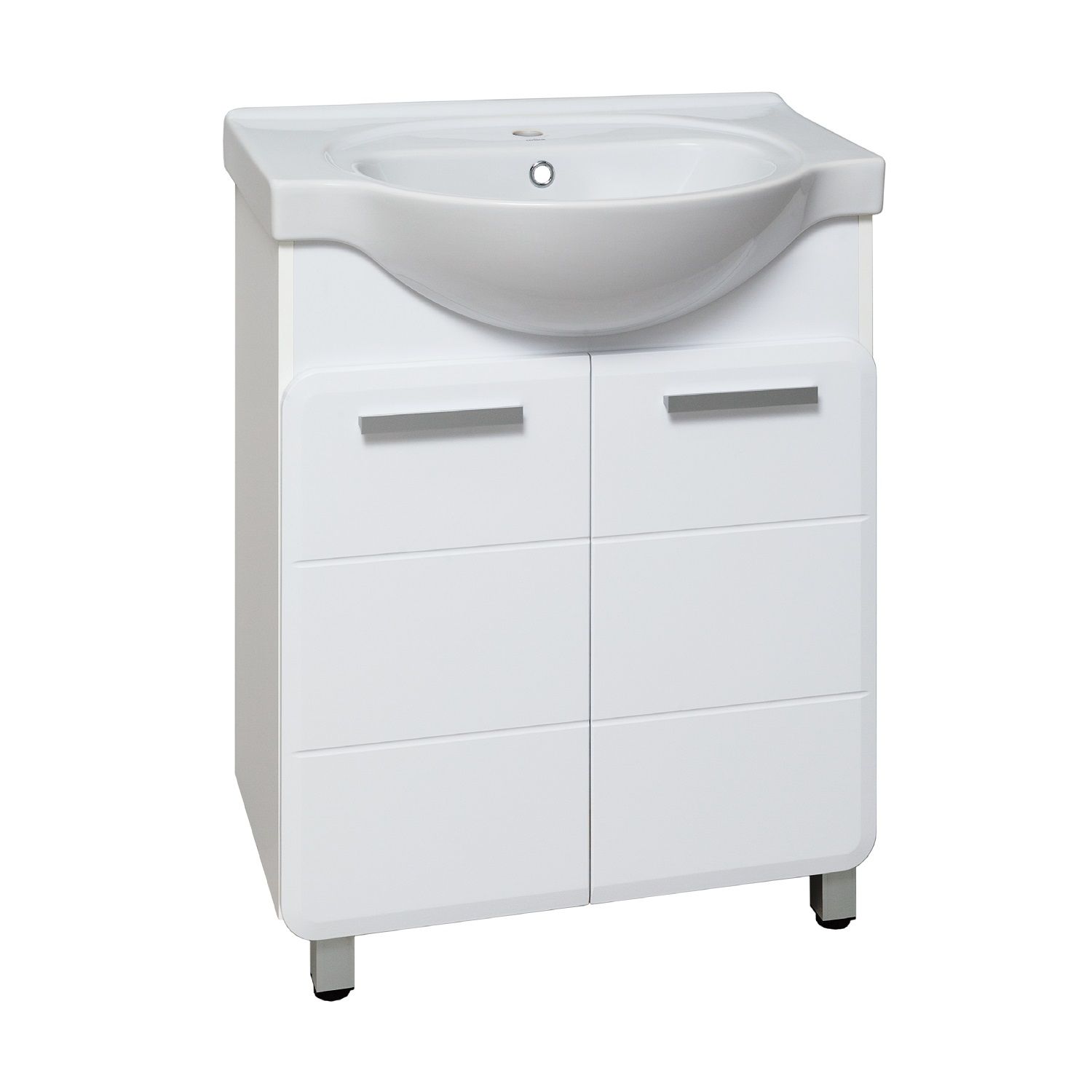 Тумба под умывальник напольная с двумя распашными фасадами и одной внутренней полкой. Петли со встроенным доводчиком, ручки - 2шт, ножки хром - 2шт, ножки пластик -2шт.