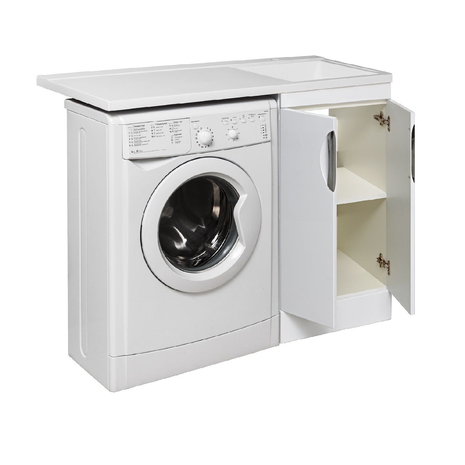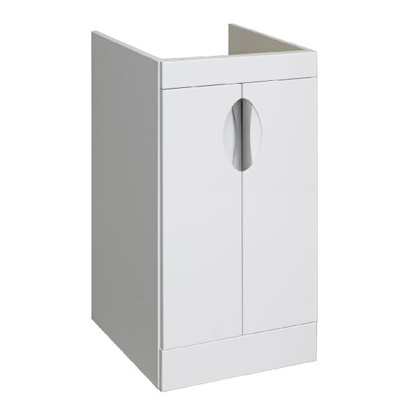 Тумба "Лира" 45 см напольная с двумя распашными дверками и одной встроенной полкой. Устанавливается на 4-е пластиковые опоры, скрытые за нижней съемной фальшь-панелью. Комплектуется умывальником из литьевого мрамора "Gamma 105 лайт" Умывальник устанавливается на тумбу и кронштейн. Модель предусматривает установку стиральной машины под крылом умывальника
