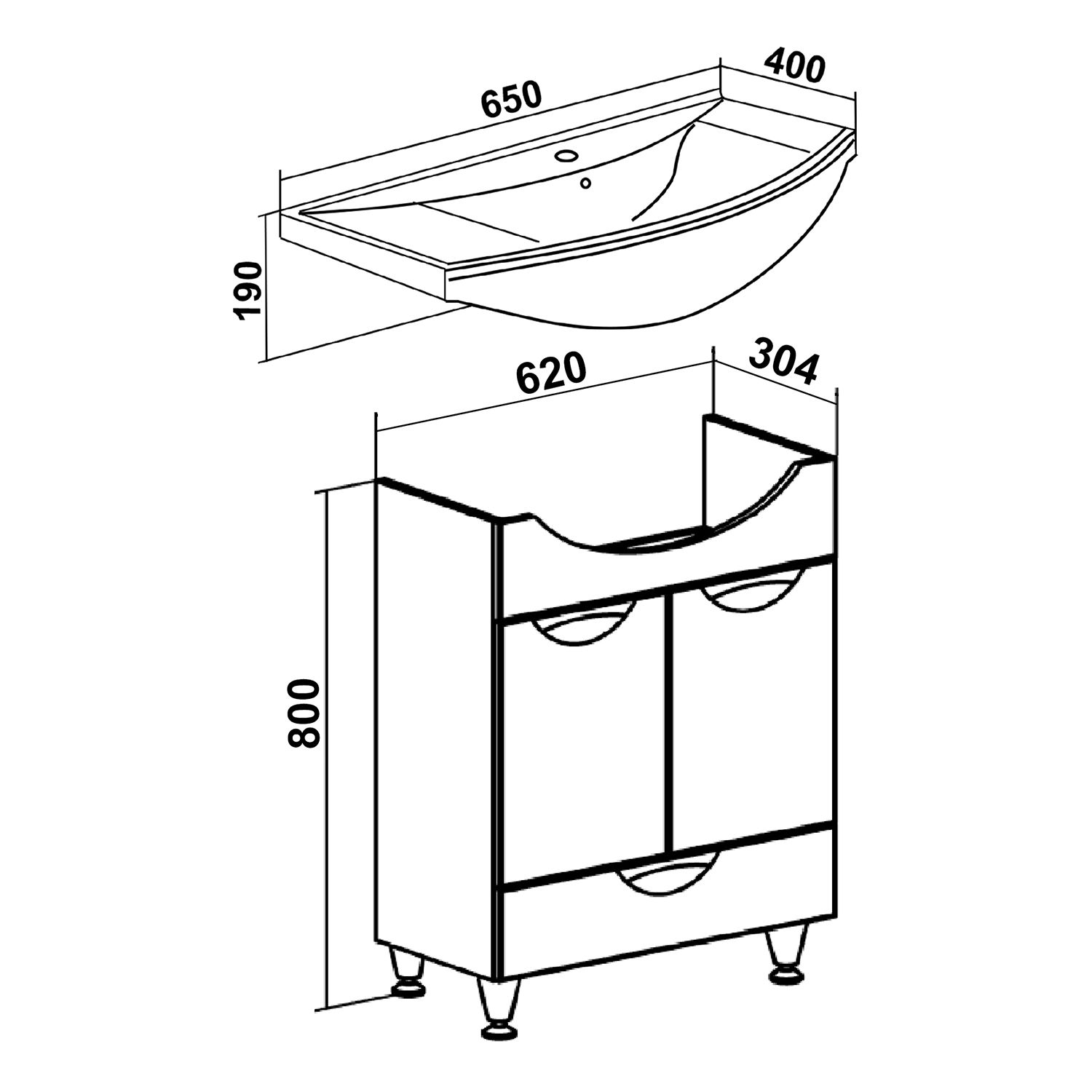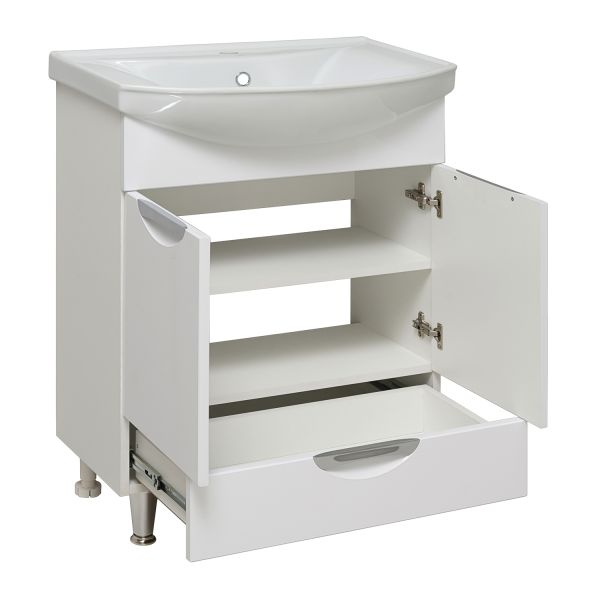 Тумба под умывальник напольная с двумя распашными фасадами и нижним выдвижным ящиком. За фасадами - одна встроенная полка. Петли со встроенным доводчиком, ящик - на шариковых направляющих полного выдвижения, ручки врезные - 3шт, ножки хром - 2шт, ножки пластик -2шт.