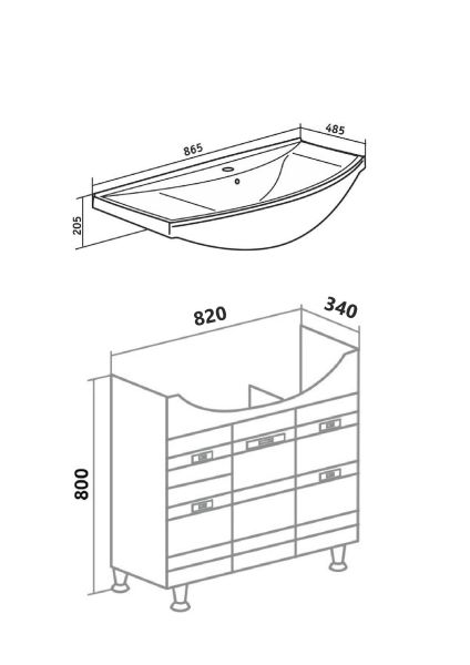 Тумба под умывальник на ножках с тремя распашными фасадами и двумя боковыми выдвижными ящиками. За центральным фасадом -одна внутренняя полка. Петли со встроенным доводчиком, ящики на шариковых направляющих полного выдвижения, ручки - 5шт, ножки хром - 2шт, ножки пластик -2шт.