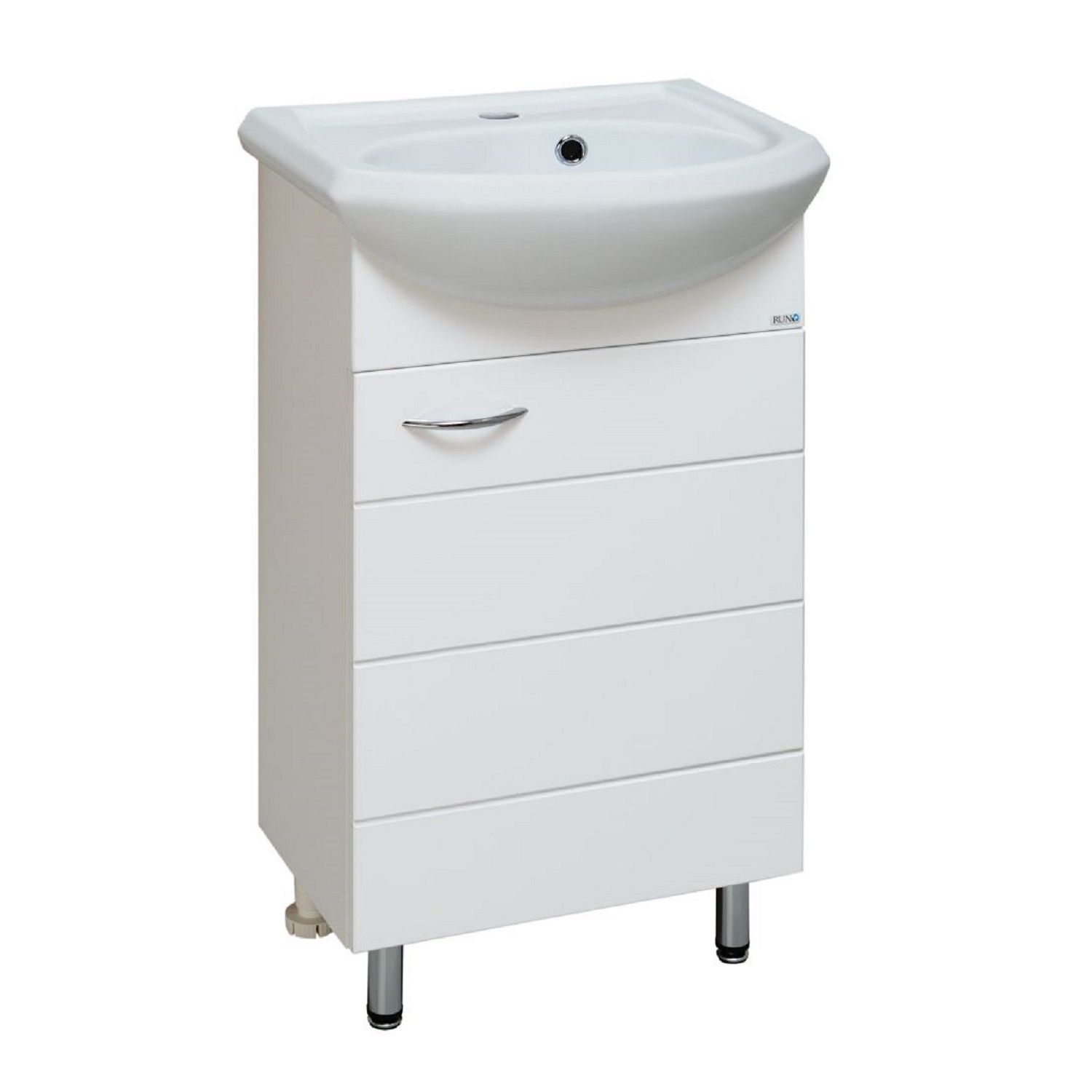 Тумба под умывальник напольная с одним распашным фасадом, открывающимся слева направо (петли справа). Петли со встроенным доводчиком, ручка - 1шт, ножки хром - 2шт, ножки пластик -2шт.