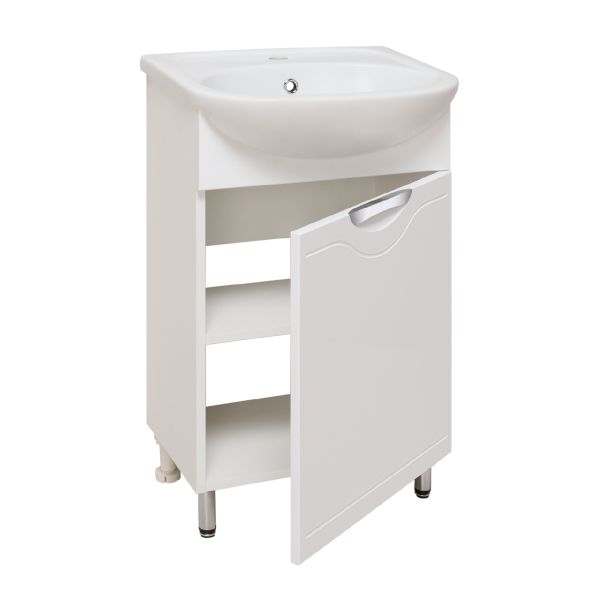 Тумба под умывальник напольная с одним распашным фасадом, открывающимся слева направо (петли справа). Петли со встроенным доводчиком, ручка врезная - 1шт, ножки хром - 2шт, ножки пластик -2шт.