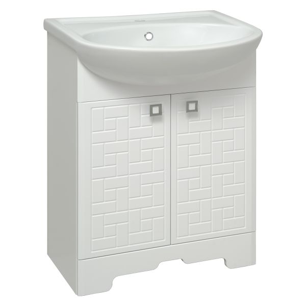 Тумба под умывальник напольная с двумя распашными фасадами и одной внутренней полкой. Петли со встроенным доводчиком, ручки - 2шт. Устанавливается на 4-е пластиковые опоры, которые скрыты за нижней фальшь-панелью.