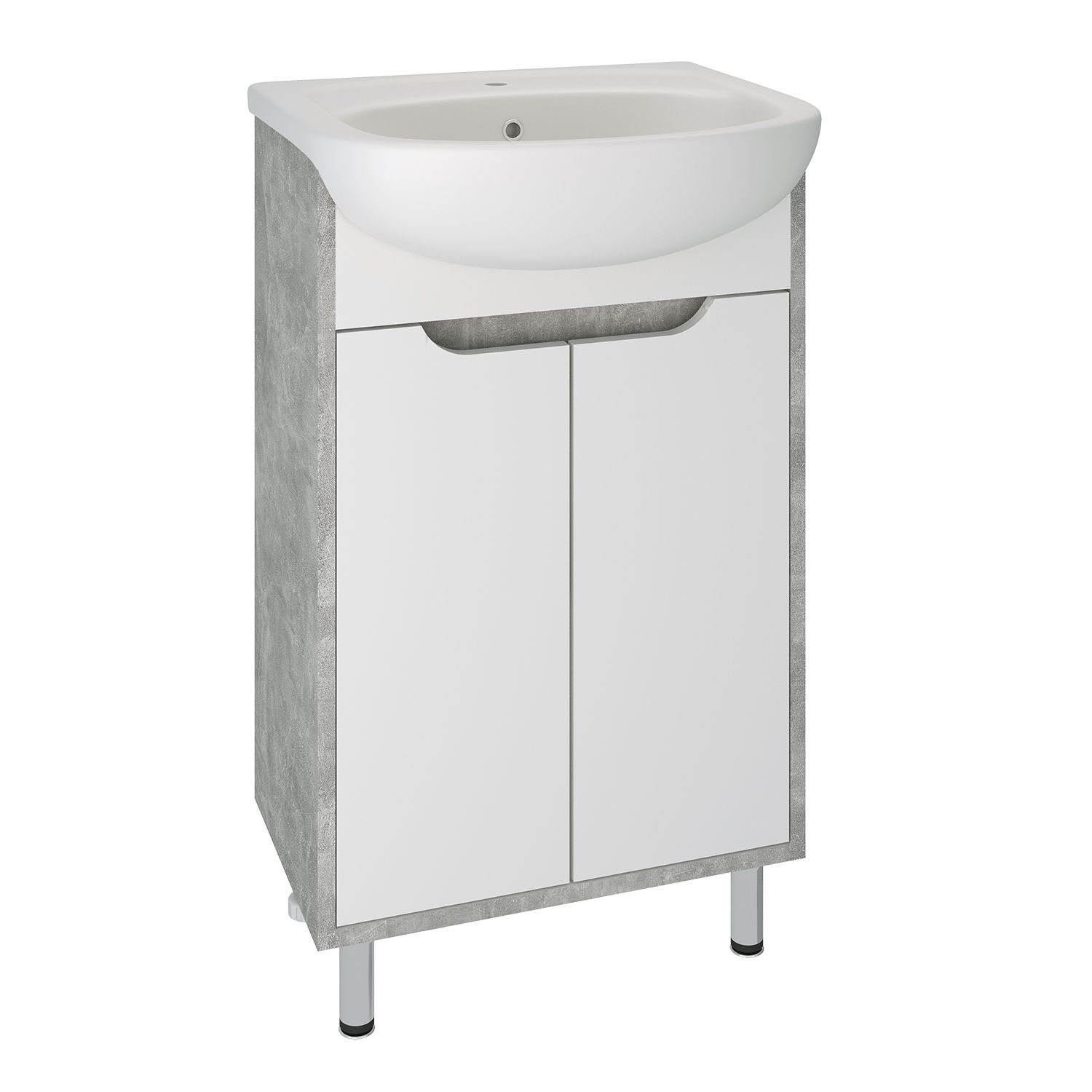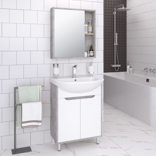 Тумба с раковиной RUNO ЭКО - превосходное решение для современного оснащения ванной комнаты. Тумба под раковину ЭКО (напольная) это стильное сочетание текстуры серого необработанного бетона на корпусе с белыми фасадами из ДСП. Тумба в ванную имеет две распашные дверцы и одну внутреннюю полку. В комплекте идут петли, 2 хромированные и 2 пластиковые ножки. Тумба для ванной комплектуется керамической раковиной "Уют" (500*420 мм). Раковина имеет глубину 18 см. Мебель для ванной RUNO - красота и практичность в мелочах!