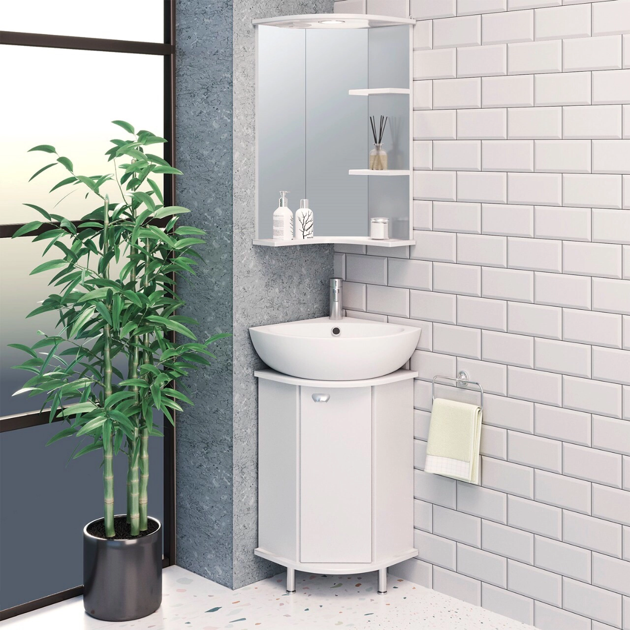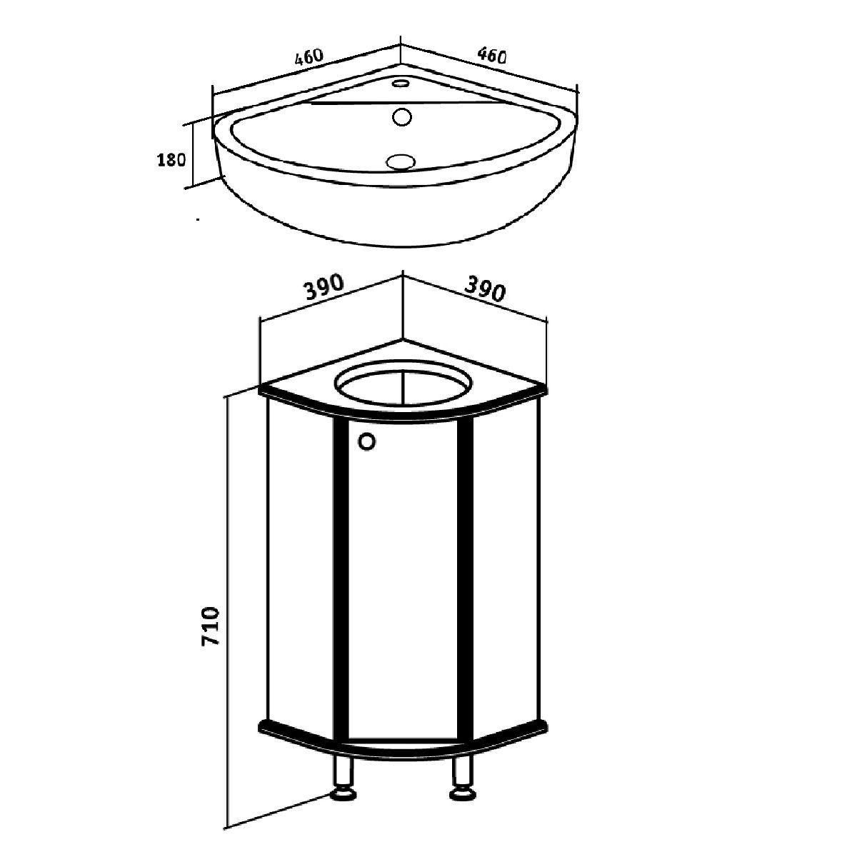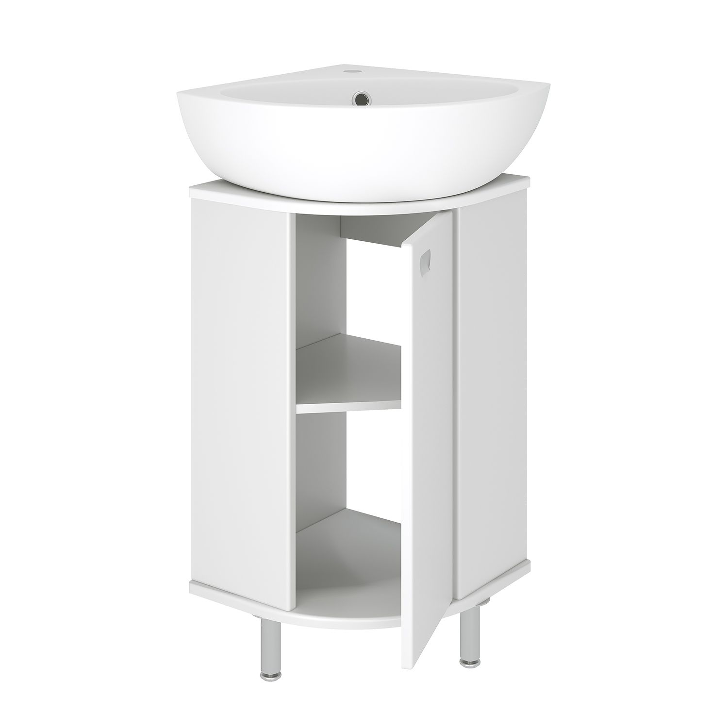 Тумба угловая напольная с одним распашным фасадом и одной внутренней полкой. Петли со встроенным доводчиком, ручка -1шт, ножки хром - 2шт, ножка пластик -1шт.