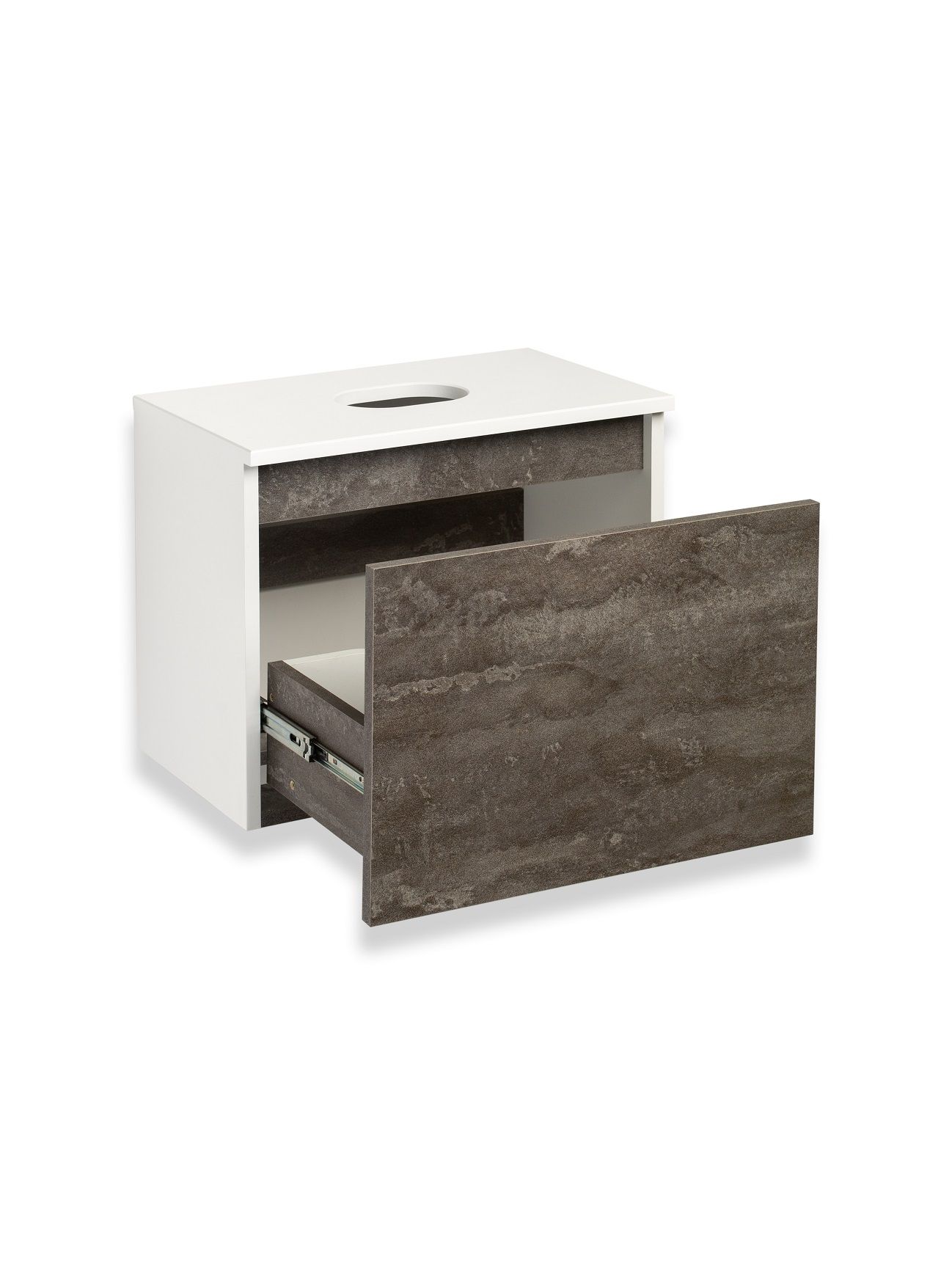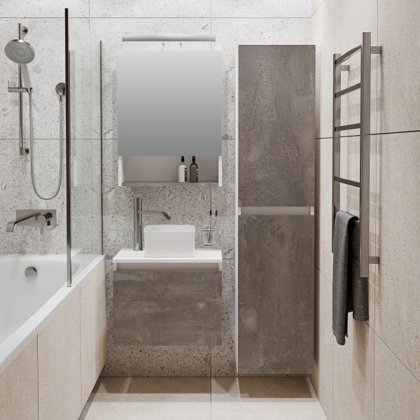 Тумба под раковину в ванную RUNO БАРИ (подвесная) - безупречное сочетание модных тенденций с классическим оформлением ванной комнаты. Тумба под раковину БАРИ оснащена выдвижным ящиком на шариковых направляющих, с системой плавного закрывания. Цвет корпуса классический - белый, при этом цвет фасада в модном цвете – железный камень, идеально впишутся в любой интерьер ванной комнаты. К тумбе для ванной подойдут умывальники на столешницу: «UNO 24» (24х24см) – очень маленькая модель, идеально подходит для ограниченного пространства в небольших помещениях. Строгая квадратная геометрически правильная форма раковины, усиливает идею лаконичности в дизайне, устанавливается на столешницу, накладным методом. «DUE 38» (38х24см) – маленькая модель, идеально подходит для ограниченного пространства в небольших помещениях. Строгая прямоугольная геометрически правильная форма раковины с округлыми углами, усиливает идею лаконичности в дизайне, устанавливается на столешницу, накладным методом.