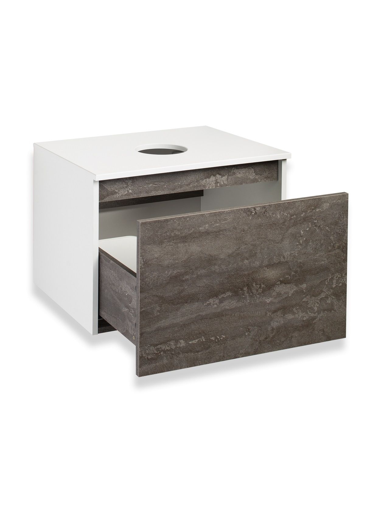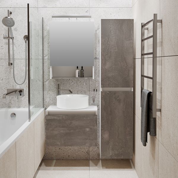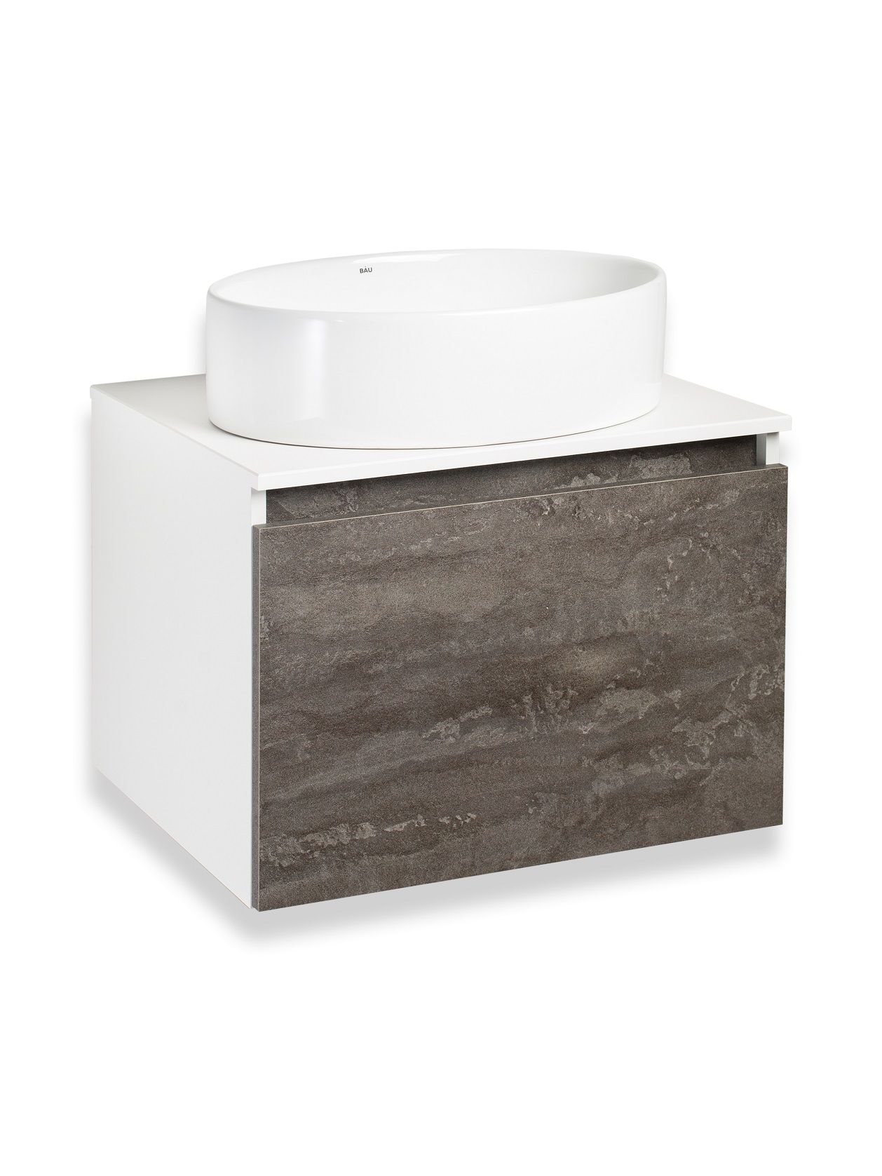 Тумба под раковину в ванную RUNO БАРИ (подвесная) - безупречное сочетание модных тенденций с классическим оформлением ванной комнаты. Тумба под раковину БАРИ оснащена выдвижным ящиком на шариковых направляющих, с системой плавного закрывания. Цвет корпуса классический - белый, при этом цвет фасада в модном цвете – железный камень, идеально впишутся в любой интерьер ванной комнаты. К тумбе для ванной подойдут умывальники на столешницу: «OVALE 50» (50х36см) - идеальное решение для стильного интерьера ванной, создан для минималистичных интерьеров и подойдёт для санузлов в стиле лофт, минимализм и хай-тек. Строгая овальная геометрически правильная форма раковины, усиливает идею лаконичности в дизайне, устанавливается на столешницу, накладным методом. «PALLA D41» (диаметр 41см) - идеальное решение для стильного интерьера ванной, создан для минималистичных интерьеров и подойдёт для санузлов в стиле лофт, минимализм и хай-тек. Строгая круглая геометрически правильная форма раковины, усиливает идею лаконичности в дизайне, устанавливается на столешницу, накладным методом. «TRE 48» (48х37см) - идеальное решение для стильного интерьера ванной, создан для минималистичных интерьеров и подойдёт для санузлов в стиле лофт, минимализм и Хай-Тек. Строгая прямоугольная форма с округлыми углами усиливает идею лаконичности в дизайне, устанавливается на столешницу, накладным методом. «TERZO 60» (59х39см) - идеальное решение для стильного интерьера ванной, создан для минималистичных интерьеров и подойдёт для санузлов в стиле лофт, минимализм и хай-тек. Асимметричная раковина, которую можно установить любой стороной, дизайнерское решение для нестандартных интерьеров, усиливает идею лаконичности в дизайне, устанавливается на столешницу, накладным методом.