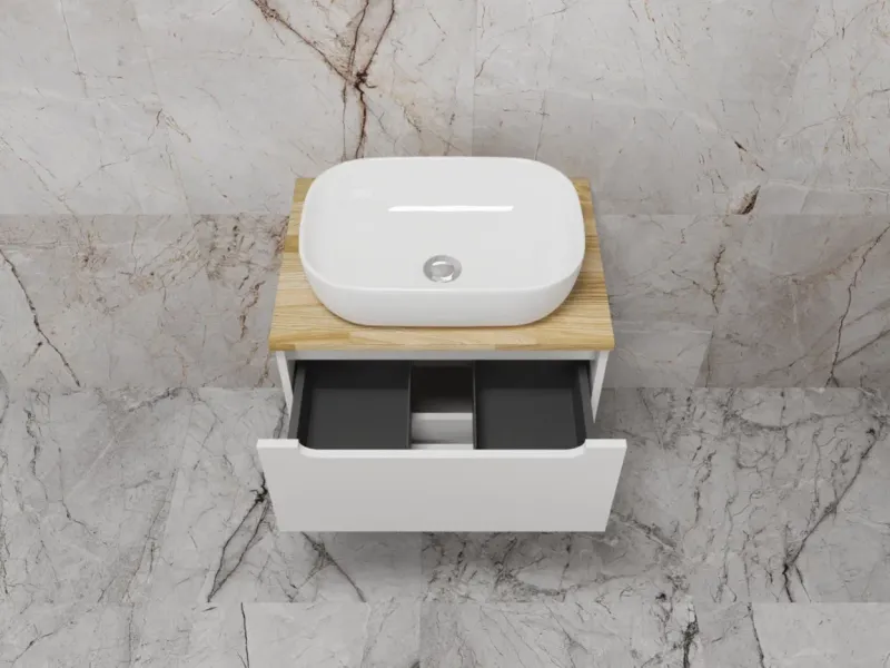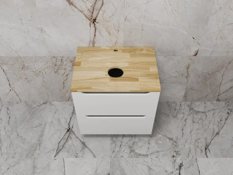 Столешница из натурального ясеня толщиной 20 мм покрыта матовым влагостойким лаком. Фасады и корпус в матовой пленке SOFT TUOCH. Внутренне наполнение из ЛДСП в декоре ГРАФИТ с эргономичным ограничителем под сифон. Фасады без ручек с лаконичным вырезом для комфортного открывания. Выдвижные ящики с системой плавного закрывания SOFT CLOSE. Экологичные и влагостойкие материалы. Легкость в уходе, практичность и стильный внешний вид.