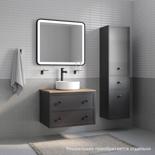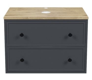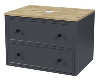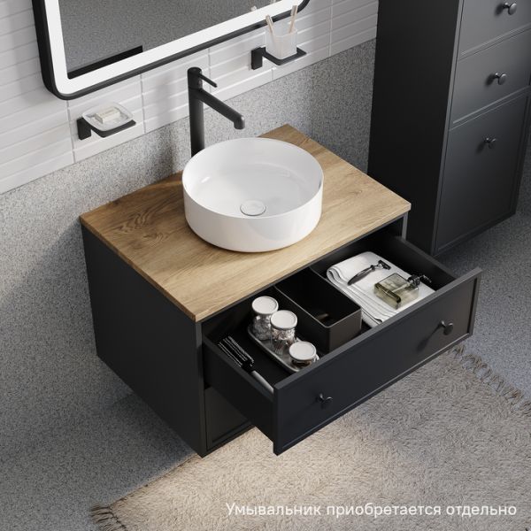 Компактная подвесная тумба Torr трендового темно-серого цвета со столешницей из МДФ в оттенке дуба верона. Сочетает в себе узнаваемый стиль и практичность популярного скандинавского дизайна. Ее четкие формы, теплый цвет дерева, фасады с декоративной филенкой, круглые ручки смотрятся гармонично и впишутся в любой современный интерьер. Подойдет любой накладной умывальник, покупается отдельно.