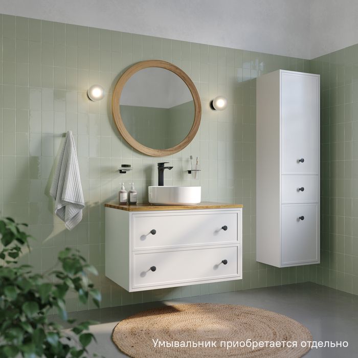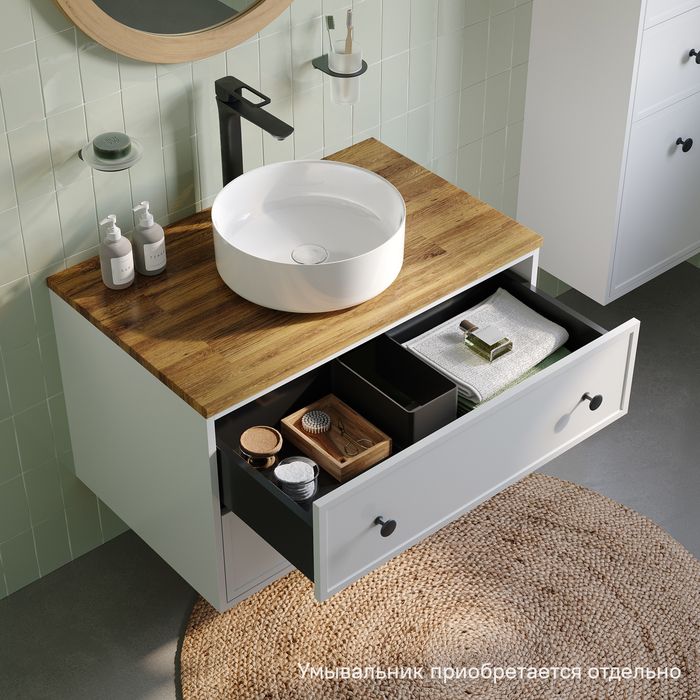 Вместительная подвесная тумба Torr классического молочно-белого цвета со столешницей из клееного натурального дуба. Сочетает в себе узнаваемый стиль и практичность популярного скандинавского дизайна. Ее четкие формы, теплый цвет дерева, фасады с декоративной филенкой, круглые ручки смотрятся гармонично и впишутся в любой современный интерьер. Подойдет любой накладной умывальник, покупается отдельно.