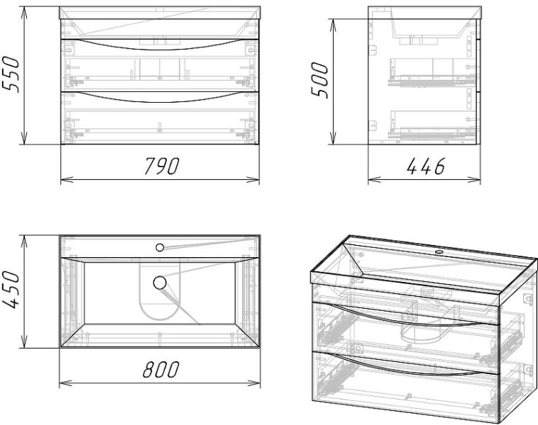 Габариты тумбы (ШxВxГ): 790x500x446 мм.