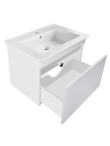 Тумба под раковину МОДЕНА (подвесная) – это изысканность и утончённая роскошь в интерьере. Волнистые рифленые фасады визуально «оживляют» и «приводят в движение» всю обстановку комнаты, сохраняя при этом умиротворение и покой, превосходно сочетаются с классическим белым цветом корпуса. Цвет фасада также классический – белый глянец, идеально впишется в любой интерьер ванной комнаты. Тумба для ванной оснащена выдвижным ящиком на шариковых направляющих, к тумбе для ванной подходит накладная керамическая раковина «Оскар» (770х470 мм). Раковина глубиной 19 см. Мебель для ванной RUNO - красота и практичность в мелочах, тумба под раковину для ванной комнаты Модена – лучший выбор для Вашей ванной комнаты!
