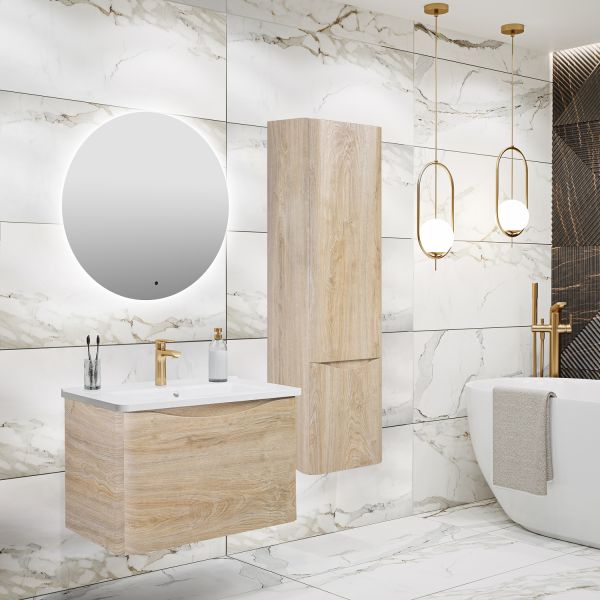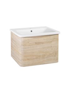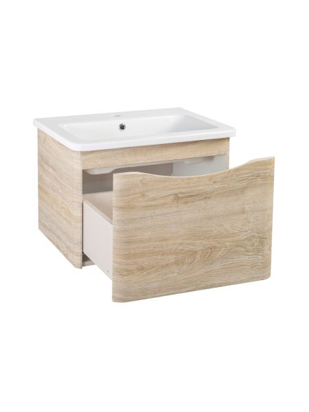 Тумба с раковиной в ванную Runo Тоскана (подвесная) - выполнена в ультрасовременном дизайне в цвете светлое дерево. Тумба под раковину отличается изысканным дизайном, скруглённые углы тумбы, древесная текстура фасада, врезная ручка – придают мебели необычный и незабываемый внешний вид. Тумба в ванную оснащена выдвижным ящиком на шариковых направляющих, с системой плавного закрывания. Тумба под раковину ТОСКАНА гармонично впишется в любой интерьер ванной комнаты. Тумба для ванной комплектуется накладным керамическим умывальником Никсон 60 (600х460 мм) ТМ Dreja, необычный дизайн которого сочетание строгих линий прямоугольника со скруглёнными углами, отражают современные тренды в дизайне. Раковина глубиной 16 см. Мебель для ванной комнаты RUNO - красота и практичность в мелочах!