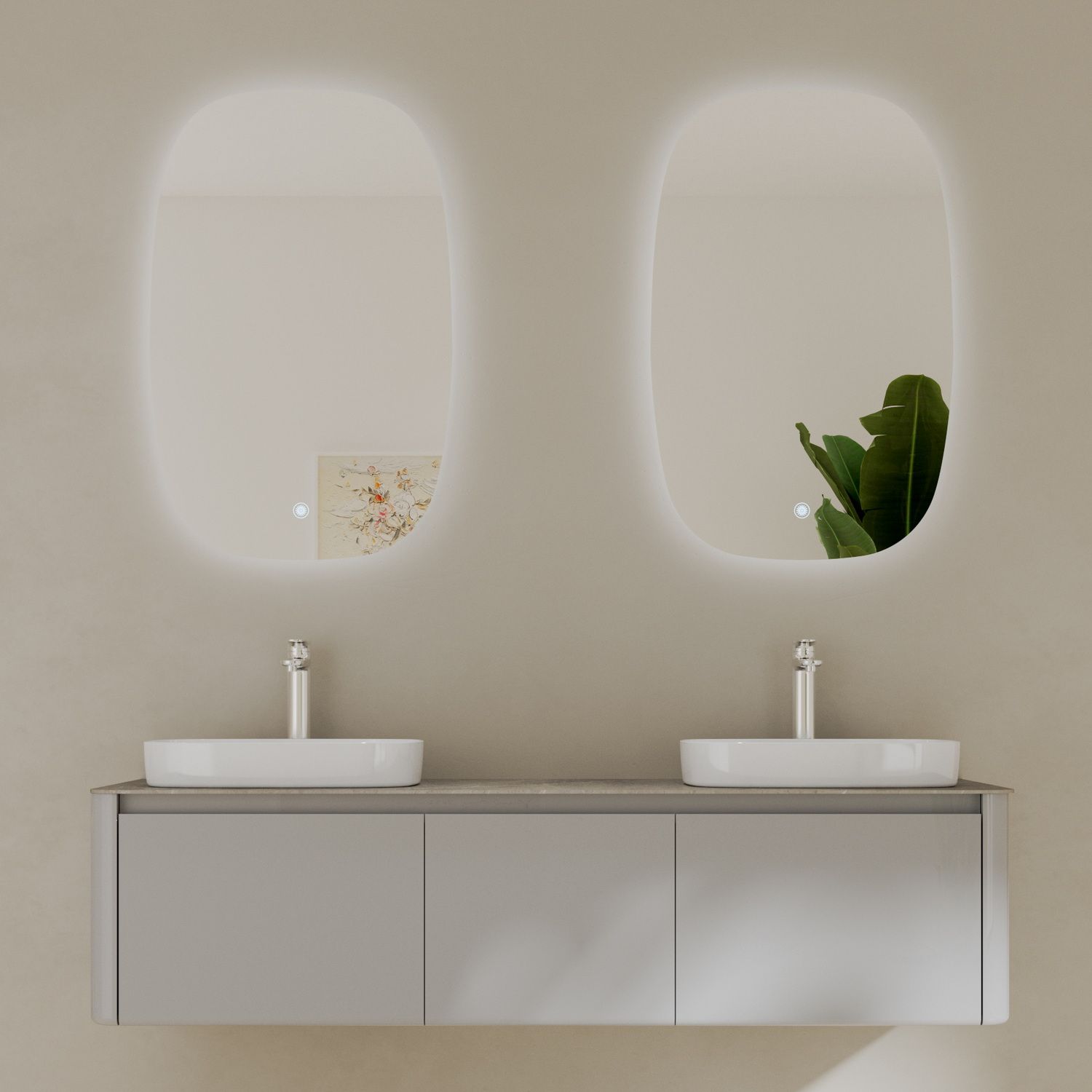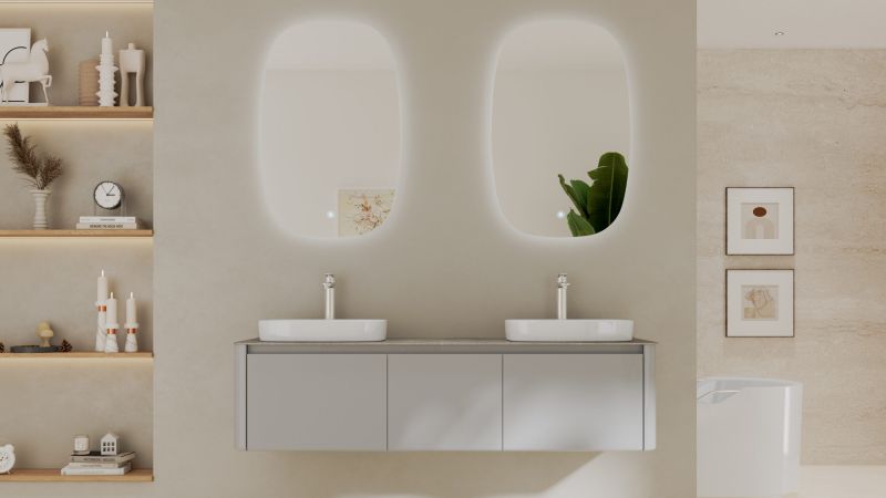 Минималистичная мебель датского производителя Black&White в габаритных размерах 160×55 см. Столешница выполнена из утонченного керамогранита стилизованного под натуральный мрамор с эффектной комбинацией цветов прожилок.Полувстраиваемые раковины поставляются вместе с донным клапаном и изготавливаются из сантехнического фарфора, а невысокие борта позволяют устанавливать смеситель любой высоты. База изготовлена из влагостойкого MDF и покрыта эмалью в цвете glossy light grey ,фурнитура для открывания выдвижных ящиков используется австрийской компании Blum. Комплект крепежа с крепежной планкой идет в комплекте.