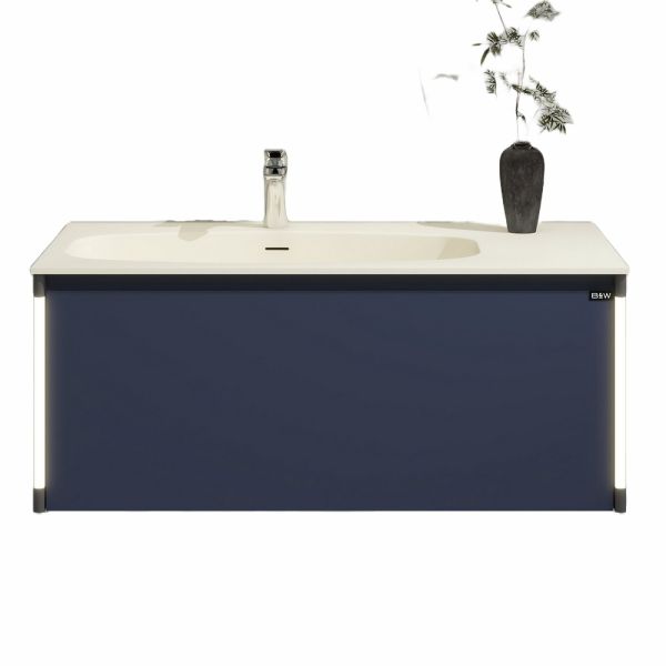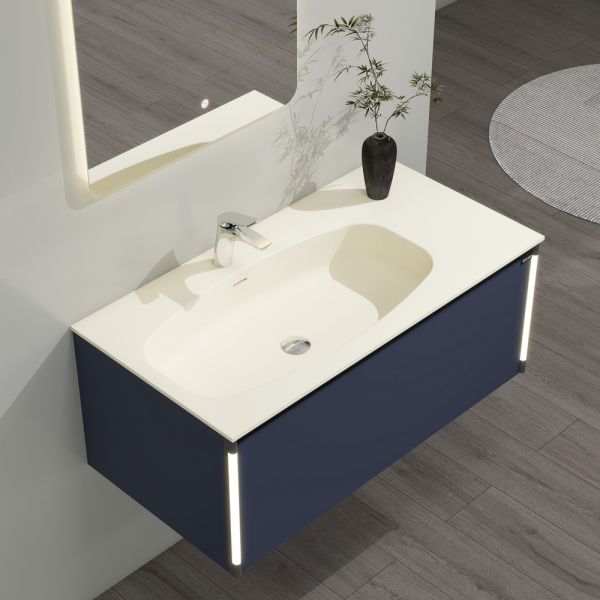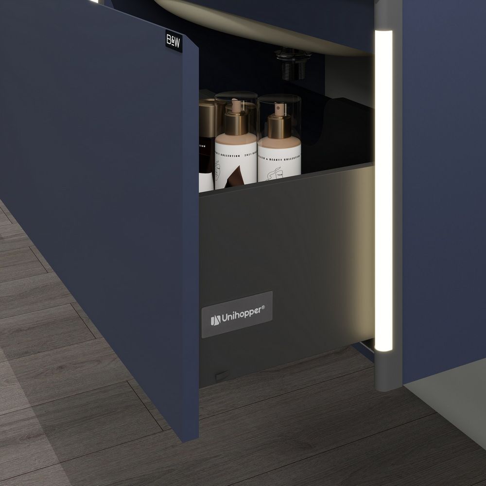 Тумба с раковиной для ванной комнаты датского производителя Black&White в габаритных размерах 100x52x36 см.Раковина – столешница асимметричной конфигурации с широкой чашей и расширенным местом для хранения  ванных принадлежностей выполнена из не пористого искусственного камня Corian и оснащена донным клапаном хромированного цвета.Тумба производится из девятислойной фанеры и окрашена влагостойкой эмалью глубокого синего цвета.Зона хранения оснащена одним выдвижным ящиком с высоким фасадом, механизм открывания – UniHopper с доводчиками.Важной особенностью является контурная диодная подсветка, которая расположена справа и слева от фасада, установленная на торцы корпуса.Она включается автоматически при приближении человека с расстояния 3-х метров и гаснет спустя 30 секунд после того, как Вы покинули помещение. U 945 – продукт разработанный датскими дизайнерами, в котором собраны все тенденции актуального мебелестроения для комфортного использования зоны умывания, а также наполнения ванной комнаты комфортом и уютом.