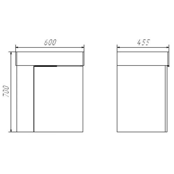 Габариты тумбы с раковиной (ШхВхД): 600х700х455 мм.
