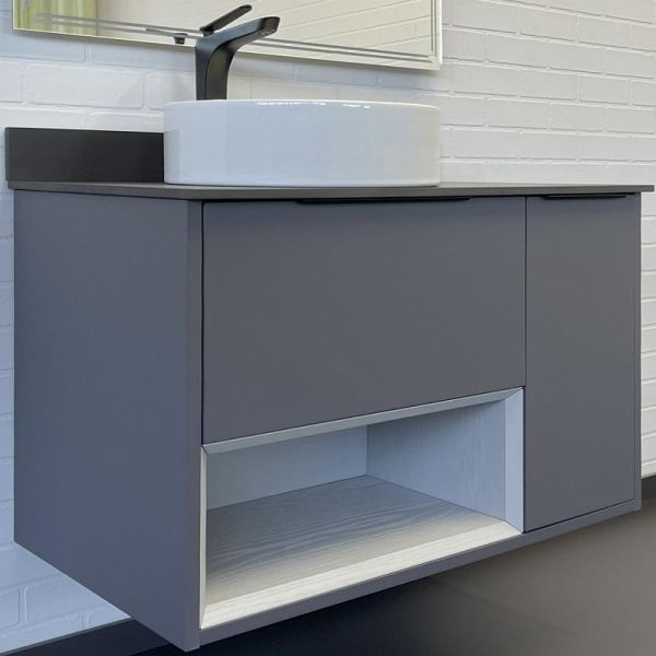 Тумба с раковиной Comforty Джанкой 00-00013694 90 см АнтрацитПодвесная тумба с одним ящиком и створкой оборудованными системой плавного закрывания. Предусмотрено пространство для открытого хранения. На фасадах тумбы черные матовые алюминиевые ручки. круглая раковина-чаша установлена на столешницу из керамогранита. В комплекте также пристенный плинтус. Ниша открытого хранения сделана из МДФ в пленке серого цвета с текстурой дерева. Торцы вставки спилены под углом.Характеристики:Тумба:Цвет: антрацит.