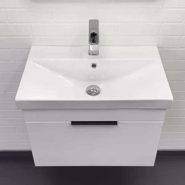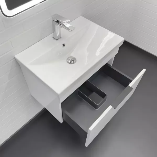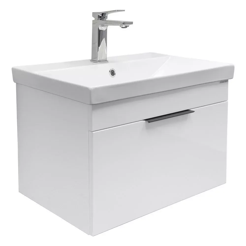 Комплектация: керамическая раковина Comforty CF19696BX-60Подвесная тумба с одним большим выдвижным ящиком оборудованным системой плавного закрывания. Фасад изготовлен из МДФ и окрашены белой глянцевой эмалью. Внутренние детали тумбы выполнены из влагостойкого ЛДСП цвета графит. Металлическая профильная ручка черного цвета. Тумба подготовлена для подключения водоснабжения сзади и снизу.