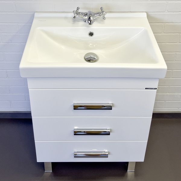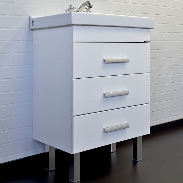 Тумба с раковиной Comforty Никосия 00-00011160 60 см белыйНапольная тумба с тремя выдвижными ящиками, оснащенными системой плавного закрывания и хромированными ручками.