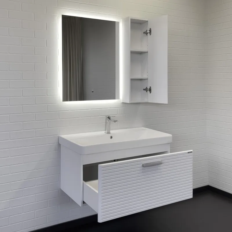 Тумба с раковиной Comforty Танжер 00-00019566 90 см белыйПодвесная тумба с одним широким выдвижным ящиком оснащенным направляющими с системой плавного закрывания. Оригинальные эргономичные ручки цвета хром. Фасады тумбы изготовлены из МДФ, фрезерованы горизонтальным узором и облицованы белой матовой пленкой. Тумба подготовлена для подключения водоснабжения снизу и сзади. В комплекте: керамическая раковина Comforty 4490