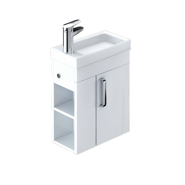 Тумба с умывальником для ванной комнаты, подвесная. Размеры тумбы без умывальника: 213х390х600 мм (ДхШхВ). Размеры умывальника: 220х400 мм (ДхШ). Фасад МДФ 16мм в эмали, боковины ЛДСП белый глянец. Одна распашная дверца, 2 открытые полки. Петли с доводчиком. Материал умывальника: фаянс, ширина: 40 см.