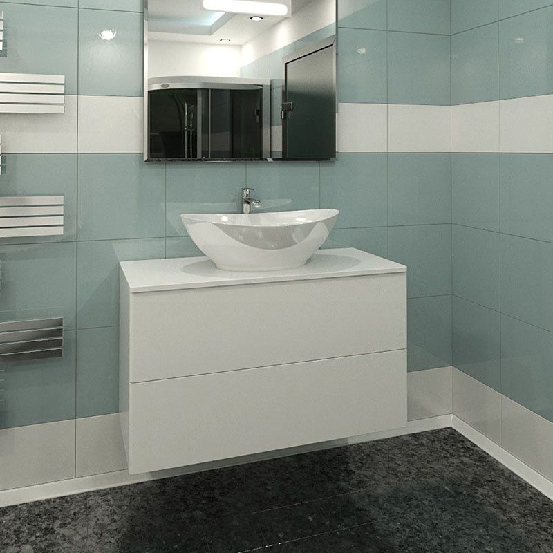 Подвесная тумба с раковиной-чашей и стеклянной столешницей, с двумя выдвижными ящиками. Предназначена для использования в ванных комнатах с повышенной влажностью. Система Push to Open: ящики открываются нажатием на них. Высокое качество сборки, материалов и фурнитуры. Корпус и фасад: МДФ, плёнка ПВХ белая глянцевая. Раковина накладная (глубина 10 см) - фаянс. Столешница: стекло окрашенное.