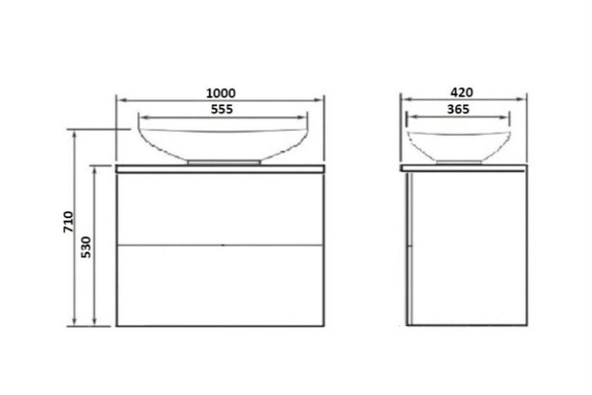 Подвесная тумба с раковиной-чашей и столешницей МДФ, с двумя выдвижными ящиками. Предназначена для использования в ванных комнатах с повышенной влажностью. Система Push to Open: ящики открываются нажатием на них. Высокое качество сборки, материалов и фурнитуры. Столешница, корпус и фасад: МДФ, плёнка ПВХ белая глянцевая. Раковина накладная (глубина 10 см) - фаянс.
