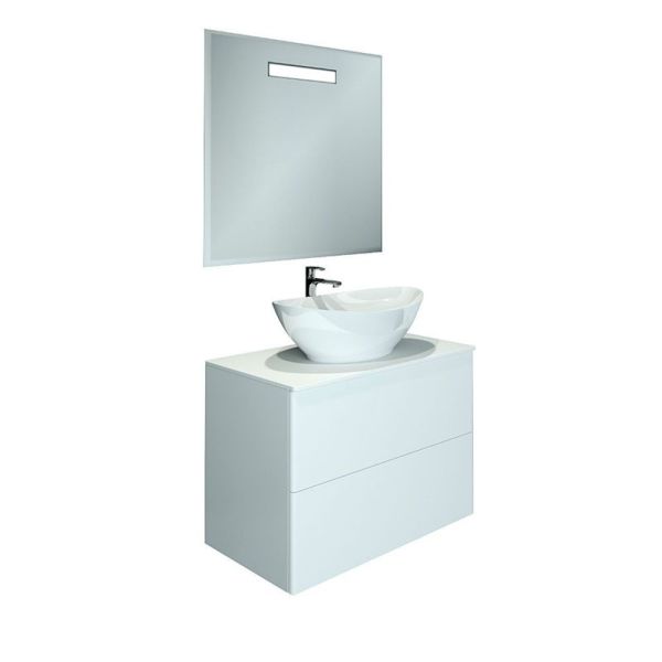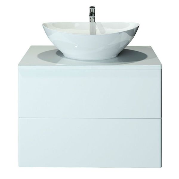 Подвесная тумба с раковиной-чашей и стеклянной столешницей, с двумя выдвижными ящиками. Предназначена для использования в ванных комнатах с повышенной влажностью. Система Push to Open: ящики открываются нажатием на них. Высокое качество сборки, материалов и фурнитуры. Корпус и фасад: МДФ, плёнка ПВХ белая глянцевая. Раковина накладная (глубина 10 см) - фаянс. Столешница: стекло окрашенное.