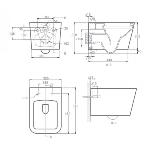 • Прилегание унитаза к стене: